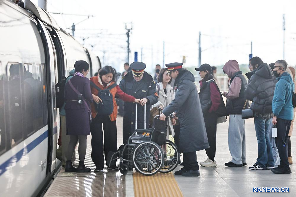 [신화망 베이징 2월21일] 19일 저장(浙江)성 자싱(嘉興)남역 승강장에서 직원이 다리를 다친 승객을 도와 휠체어에 태우고 안전하게 역을 빠져나올 수 있도록 서비스를 제공하고 있다.