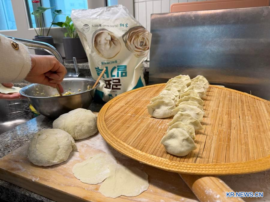 섣달그믐날 밤 한국에서 가족과 함께 자오쯔(餃子·교자)를 빚는 장광페이. (사진/신화통신)