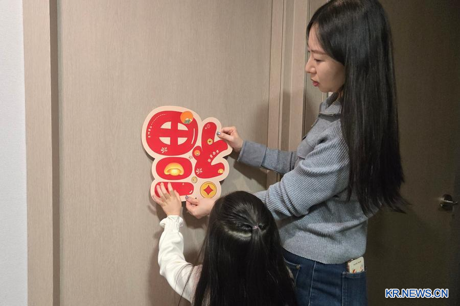 섣달그믐날 밤 한국 경기도 집에 '복(福)'자 장식품을 붙이고 있는 장광페이(張廣菲)와 그의 딸. (사진/신화통신)