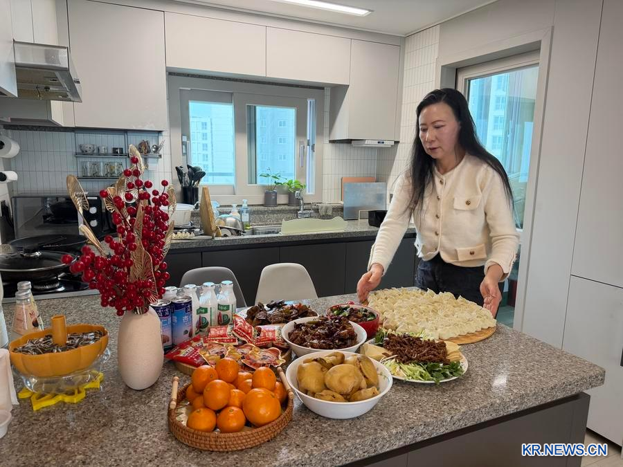 장광페이의 어머니가 한국에서 녠예판(年夜飯·섣달 그믐날 함께 모여 먹는 가족 식사)을 준비하고 있다. (사진/신화통신)