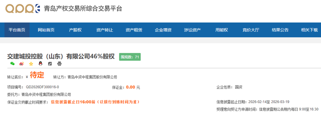 近日,交建城投控股(山东)有限公司46%股权转让公告发布,转让方是青岛中资中程集团股份有限公司,转让底价待定,信息披露日期截止至3月19日。