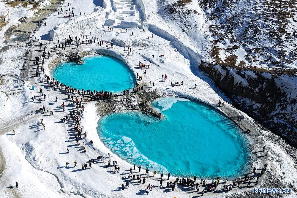20일 칭하이(青海)성 하이베이(海北)짱(藏)족자치주 강스카(崗什卡) 설산을 찾은 관광객을 드론으로 내려다봤다. 2026.2.20