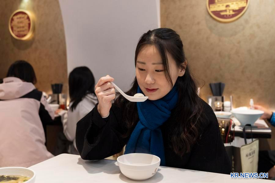상하이 예원에서 탕위안(湯圓∙새알심)을 먹는 최지하 씨. (사진/신화통신)
