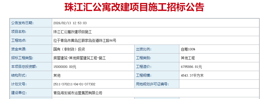 近日,珠江汇公寓改建项目施工招标公告发布,工程地点位于青岛市黄岛区薛家岛街道珠江路96号,总投资1500万元,建设单位为青岛海发城市运营集团有限公司。