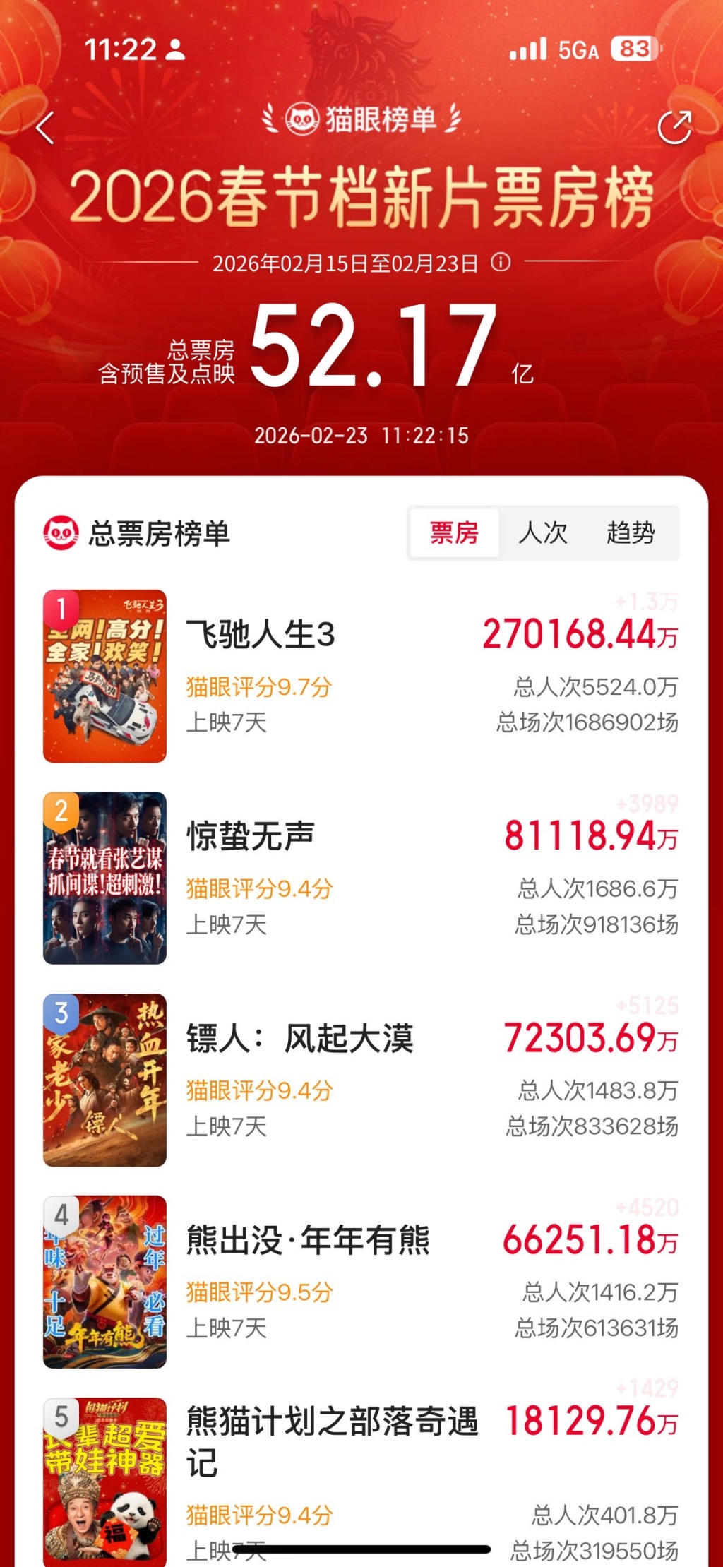 据猫眼专业版数据,截至2月23日11时20分,2026年春节档期总票房(含预售)52.17亿元。在这个从腊月二十八一直延续到正月初七的“史上最长春节档”里,《飞驰人生3》《惊蛰无声》《镖人:风起大漠》三部题材各异的影片分列前三位,联手为马年电影市场献上了热辣滚烫的开门红。截至目前,春节档观影人次已破亿,这也是春节档连续8年观影人次破亿。值得一提的是,陪伴观众走过十二年的“熊出没”系列最新作《熊出没·年年有熊》票房已突破6.6亿元,稳居档期第四位,继续扮演着“春节档隐形富豪”的角色。