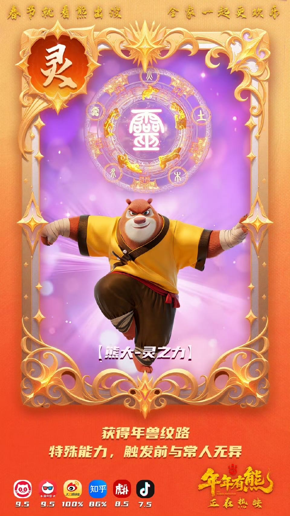 《熊出没·年年有熊》首次打开了“中式奇幻”的大门。影片中,熊强三人组误入年关城,帮助年兽觉醒神力,与代表毁灭的“煞”展开终极对决。这一设定跳出了系列此前深耕多年的科幻轨道,以“年”所代表的生命力量唤醒万物新生,生机盎然的绿、澎湃壮阔的浪潮,以及年年“变身开大”时千丝万缕的华彩效果,展现出瑰丽奇幻的视觉美学。