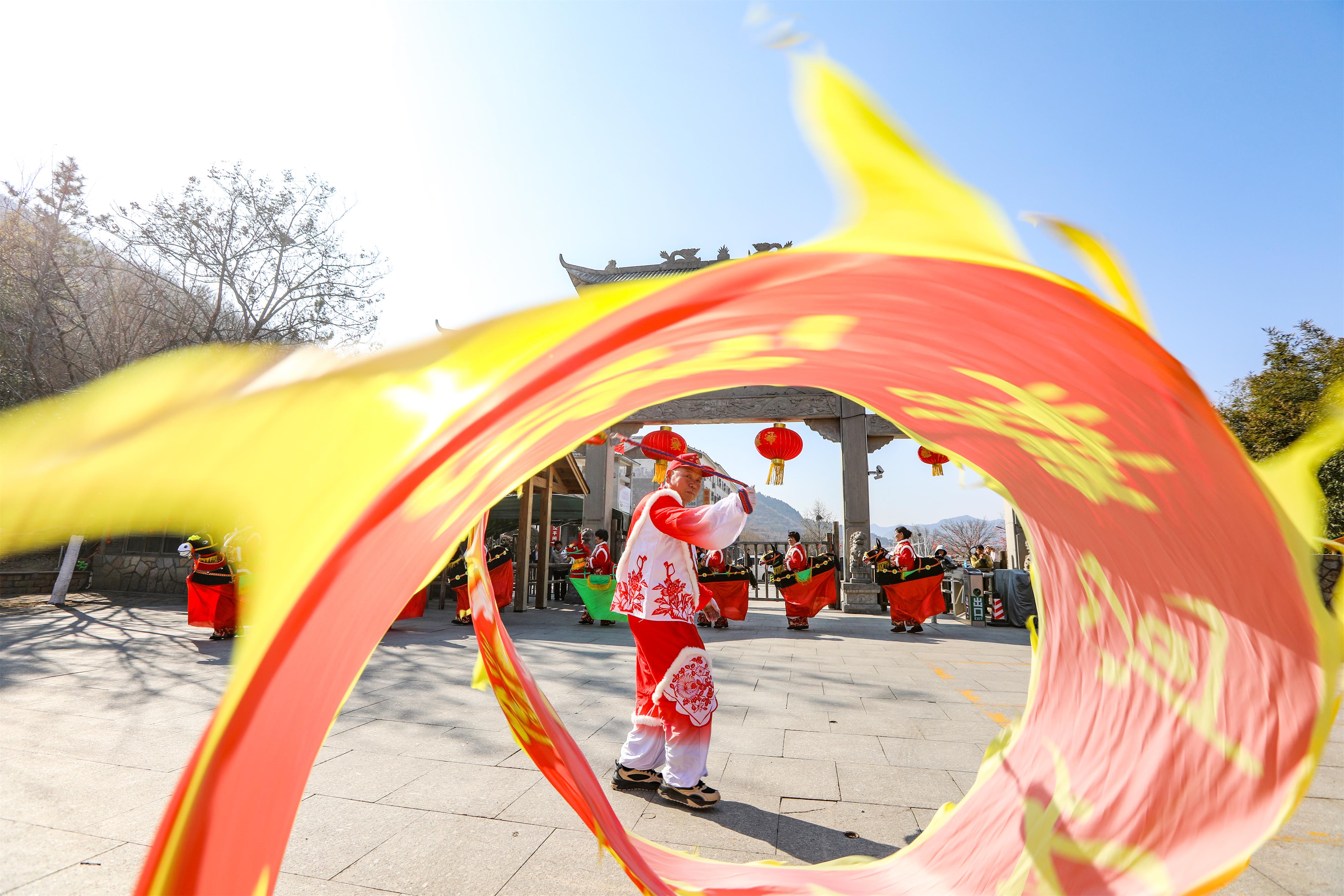 走进景区民俗体验区,锣鼓声、欢笑声交织成一片热闹的海洋。非遗舞龙、扭秧歌、小毛驴等传统表演轮番登场,表演者身着喜庆红装,踏着铿锵鼓点欢快起舞,将地道的山东民俗魅力展现得淋漓尽致。