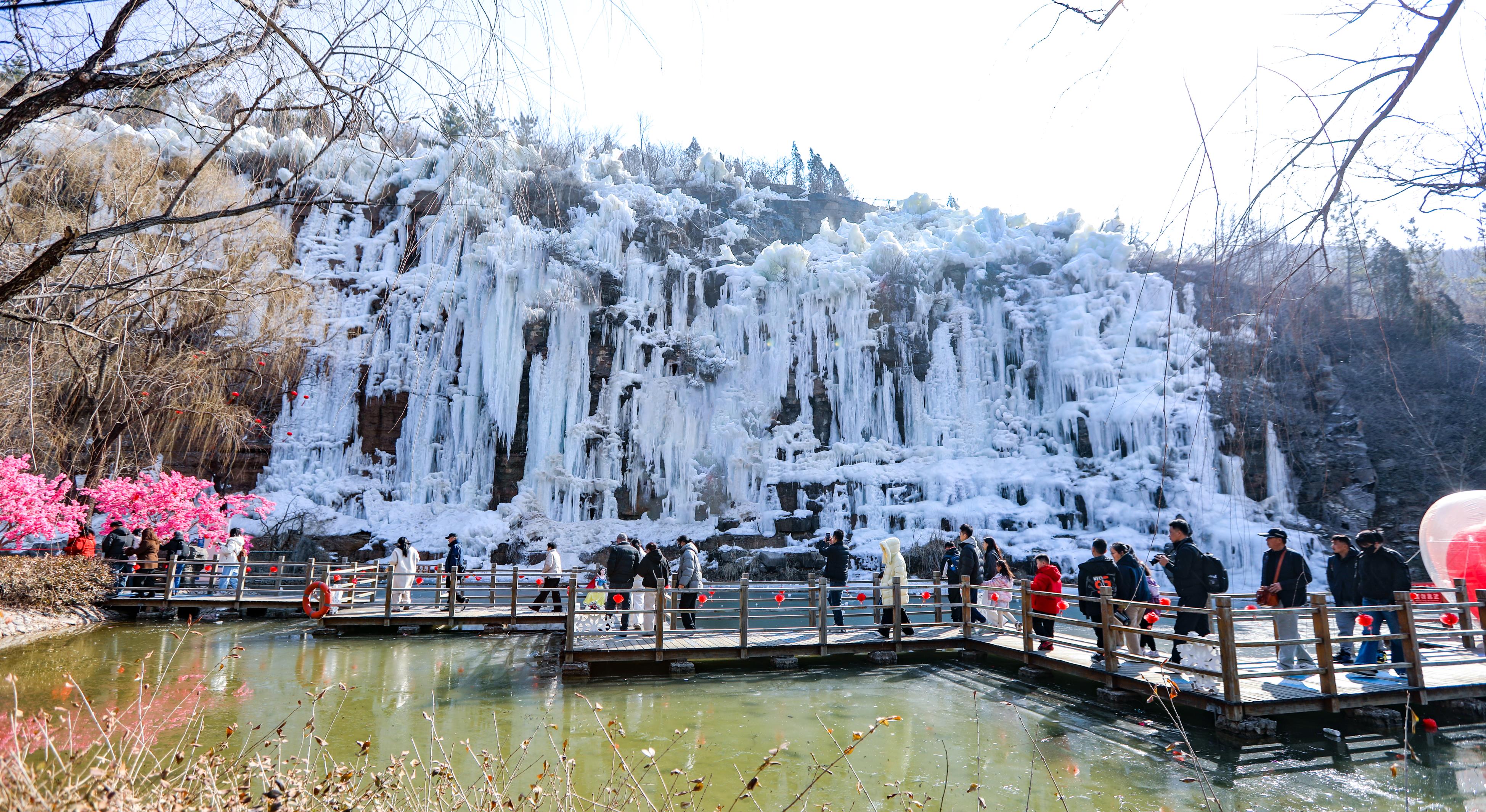 在冰雪景观区,大自然馈赠的冬日美景让人惊叹。百米冰瀑宛如一幅巨型玉帘垂挂山间,冰柱晶莹剔透,在暖阳的照耀下熠熠生辉。这片冬日限定的“冰雪秘境”成为游客必到的打卡胜地,大家纷纷驻足拍照,用镜头定格这份独属于潭溪山的新春美景。