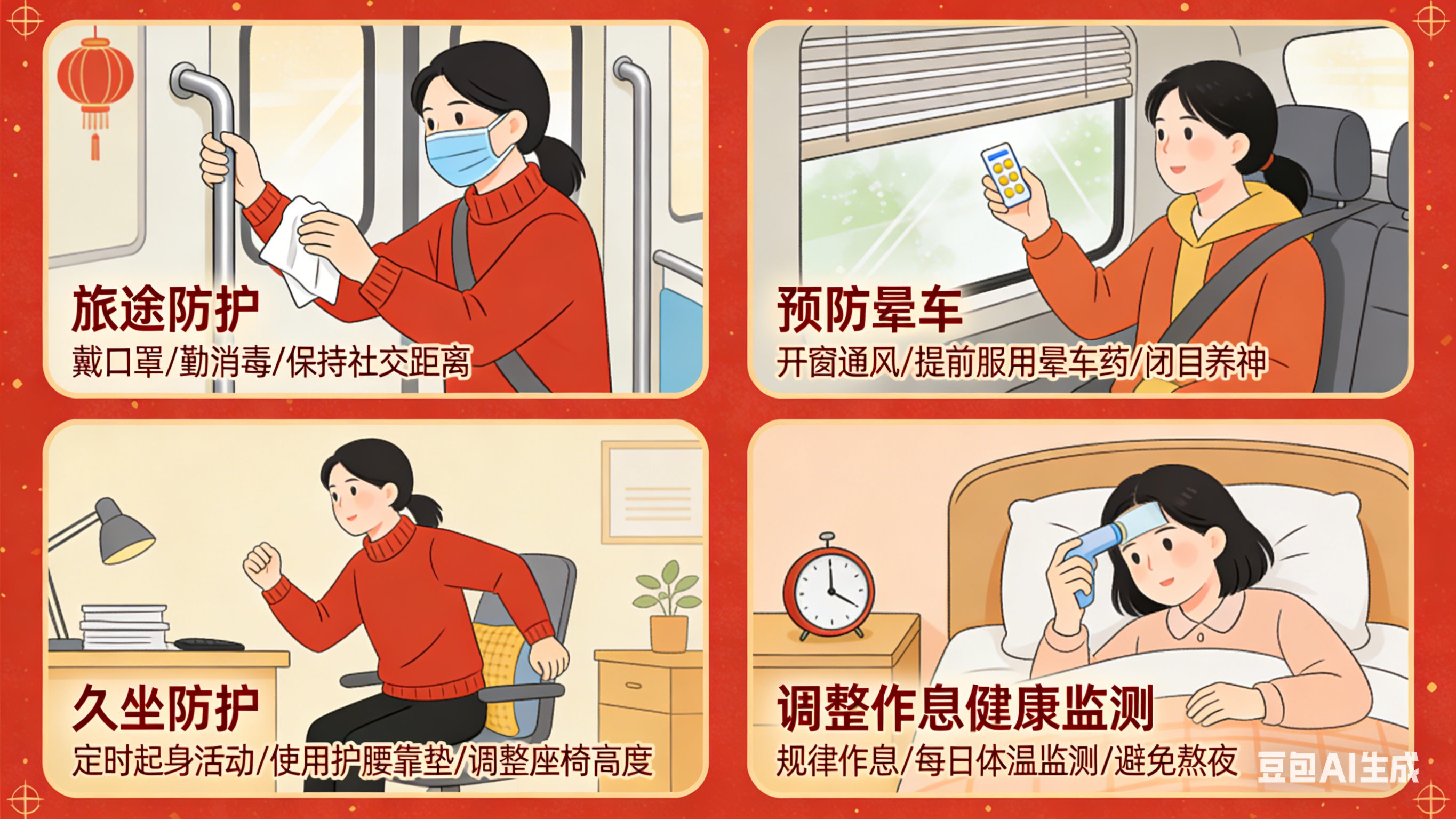 春节假期即将结束,不少人已背起行囊踏上返程旅途。无论是自驾、坐高铁还是长途客车,长时间赶路易引起疲劳、晕车等不适,加之气温波动、人员密集,流感、感冒风险增加。