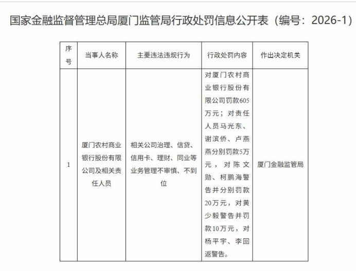 厦门农商银行被罚605万元,因相关公司治理、信贷、信用卡等业务管理不审慎、不到位