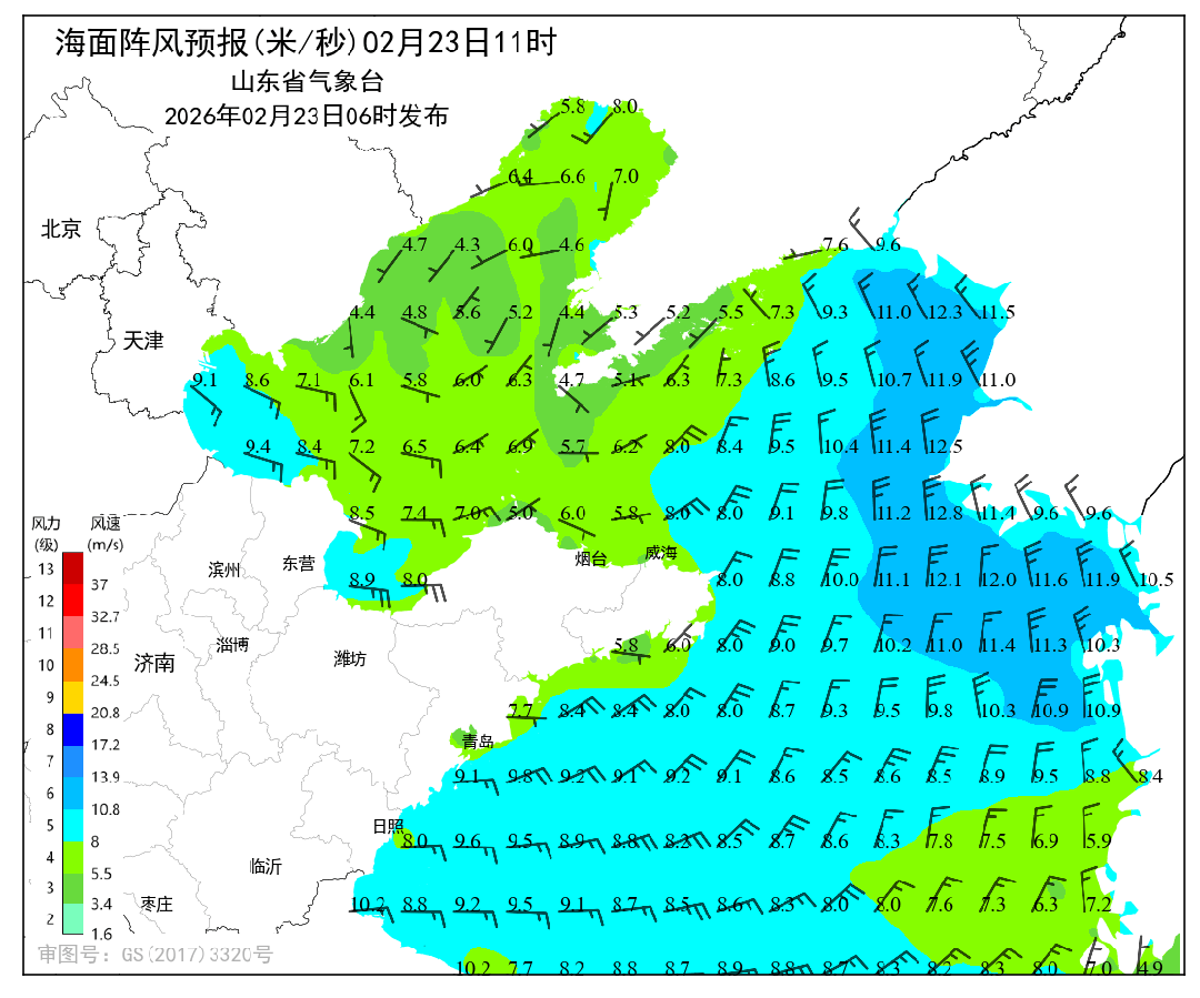 海上大风警报:23日白天,渤海和渤海海峡南风5~6级,黄海北部和中部北风转南风5~6级;23日夜间,黄海中部南风5~6级转北风6~7级阵风8级,渤海、渤海海峡和黄海北部南风5~6级。