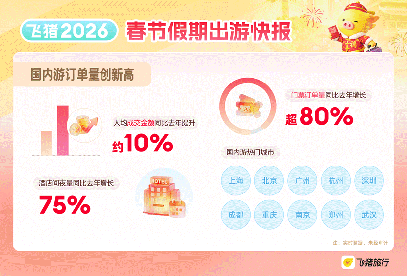 为期9天的马年春节假期正式结束。飞猪数据显示,春节假期国内游订单量再创新高,其中门票订单量同比去年增长超80%,酒店间夜量同比增长75%。更长假期还带来节中出游需求的进一步释放,大年初二至初五之间出行的订单量同比增长约三成。