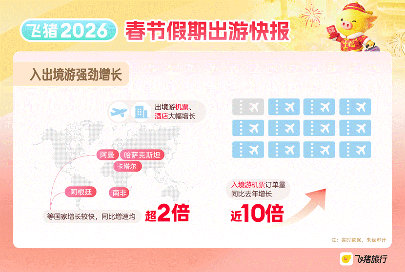 跨境游继续强劲增长。飞猪数据显示,出境游机票、酒店、当地玩乐订单量均保持30%以上的同比增速,中国香港、中国澳门以及“四小时飞行圈”内的东南亚国家依然是出境游热门目的地,阿曼、哈萨克斯坦、南非、卡塔尔、阿根廷等中长线出境游目的地保持较快增速,订单量同比增长均超过2倍。