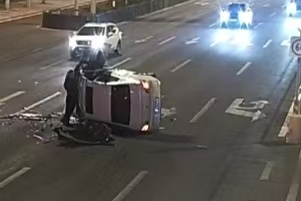 2月21日(大年初五)晚上21时38分,威海市世昌大道汇峰岗附近发生一起交通事故,其中有车辆侧翻,驾驶员被困车内,情况危急。