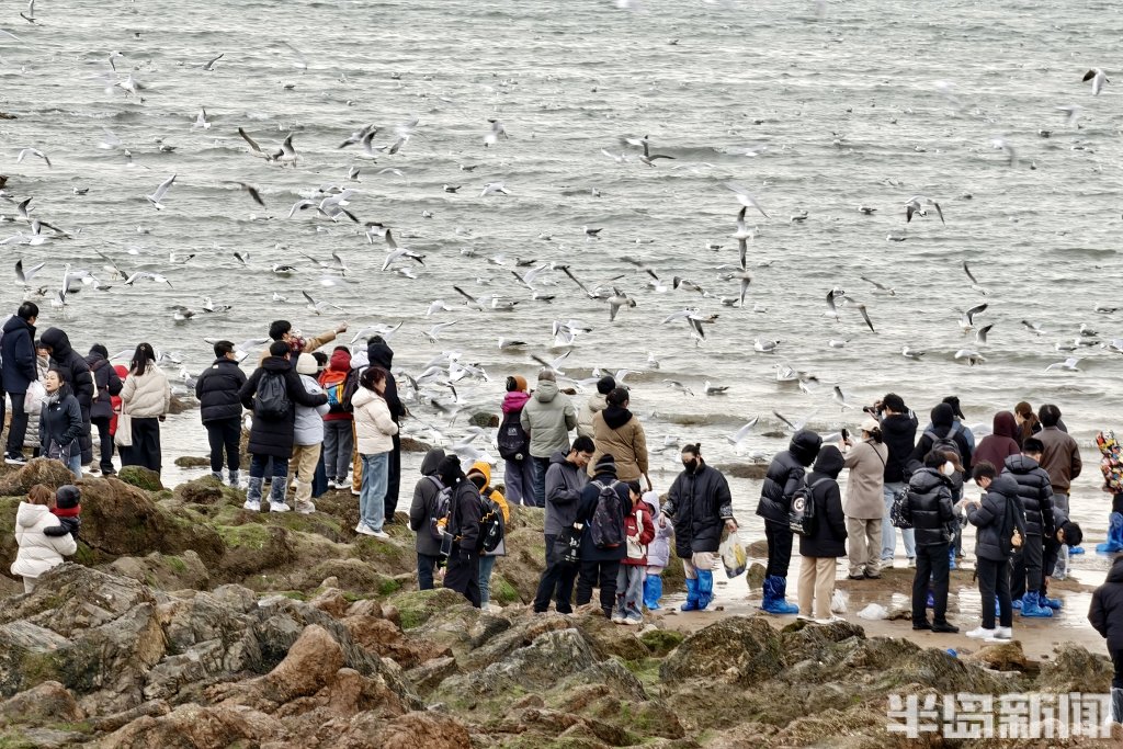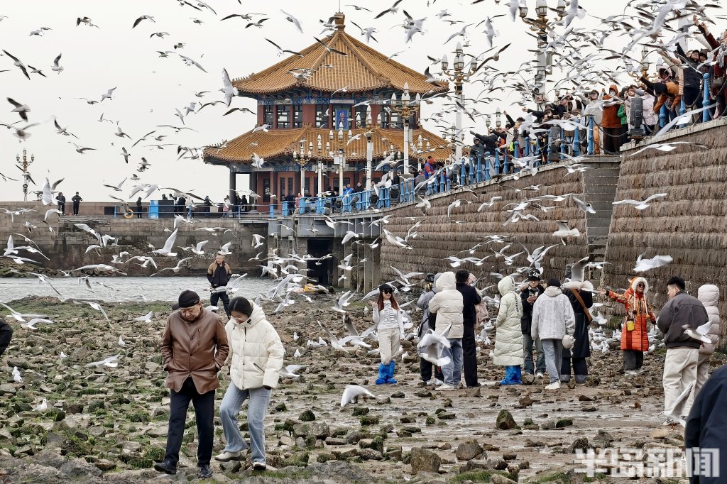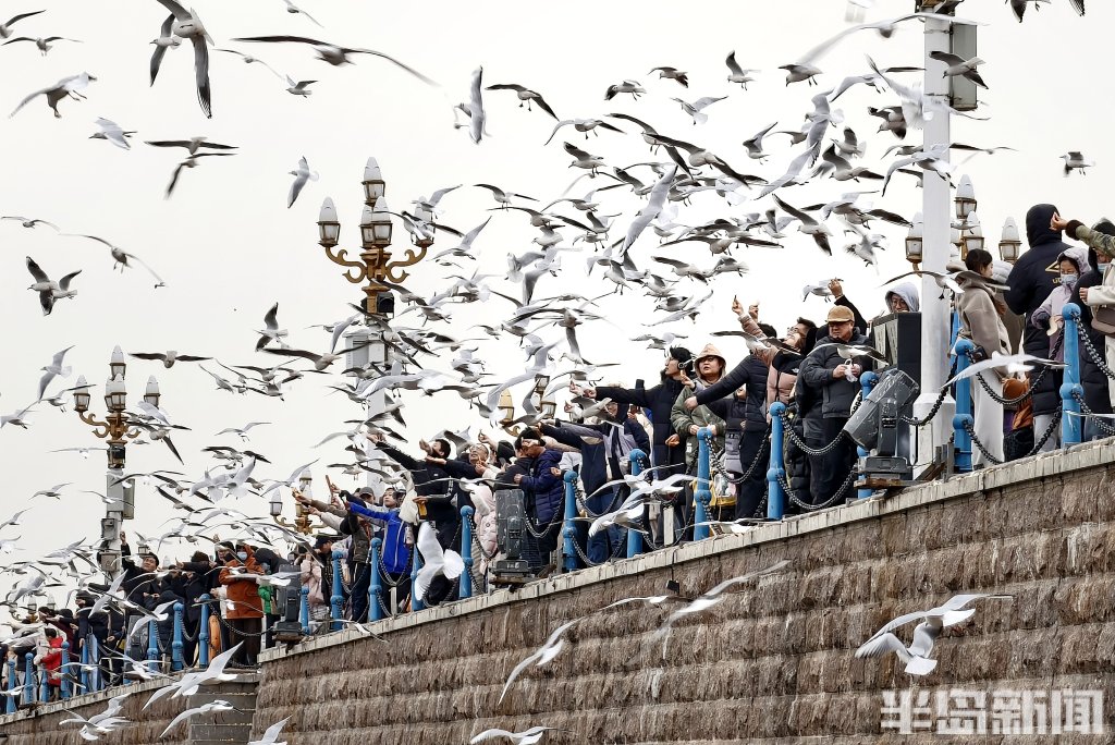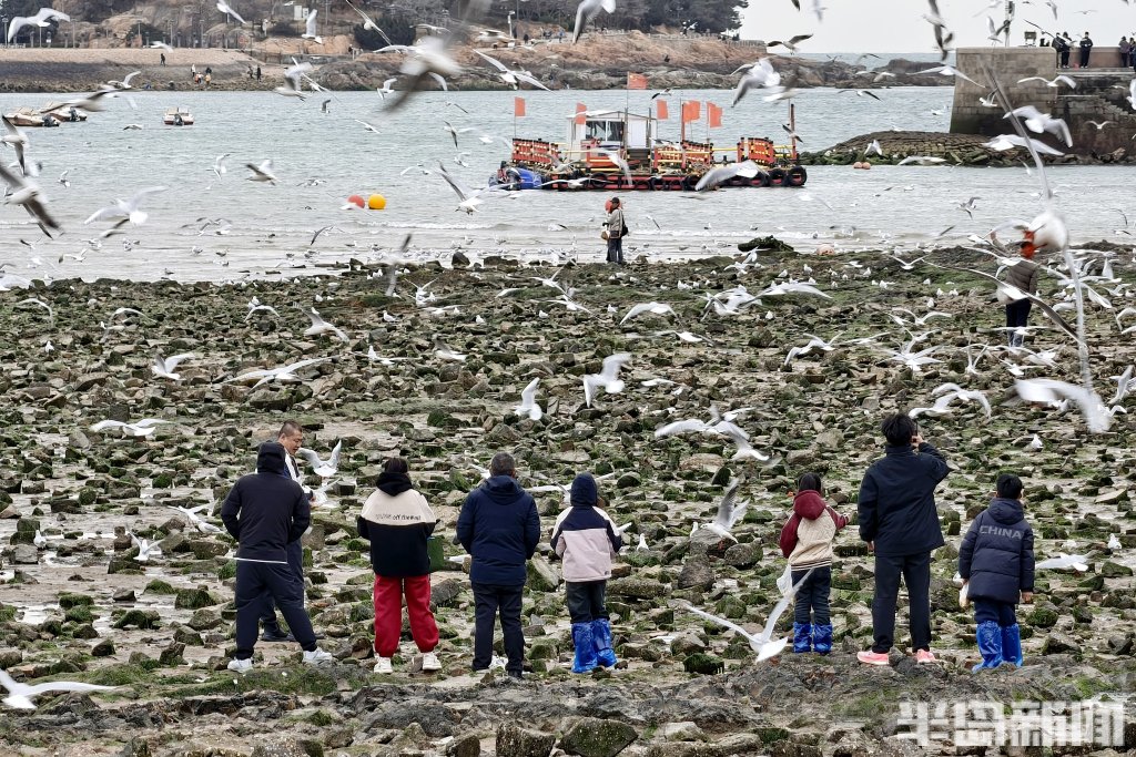 当日栈桥桥面上人头攒动。游客们裹紧羽绒服、戴上棉帽,在凛冽的海风中兴致勃勃地倚栏远眺。桥下的沙滩上,密密麻麻的海鸥或盘旋低飞,或浮水嬉戏,引得人们纷纷掏出手机、相机定格瞬间。沙滩与礁石上站满了喂鸥的人群,大家将手中的面包掰成小块奋力抛向空中,机敏的海鸥精准叼住,引来阵阵欢呼。那些飞旋在空中的海鸥,似乎也懂得人们的留恋,久久盘旋,不舍离去。