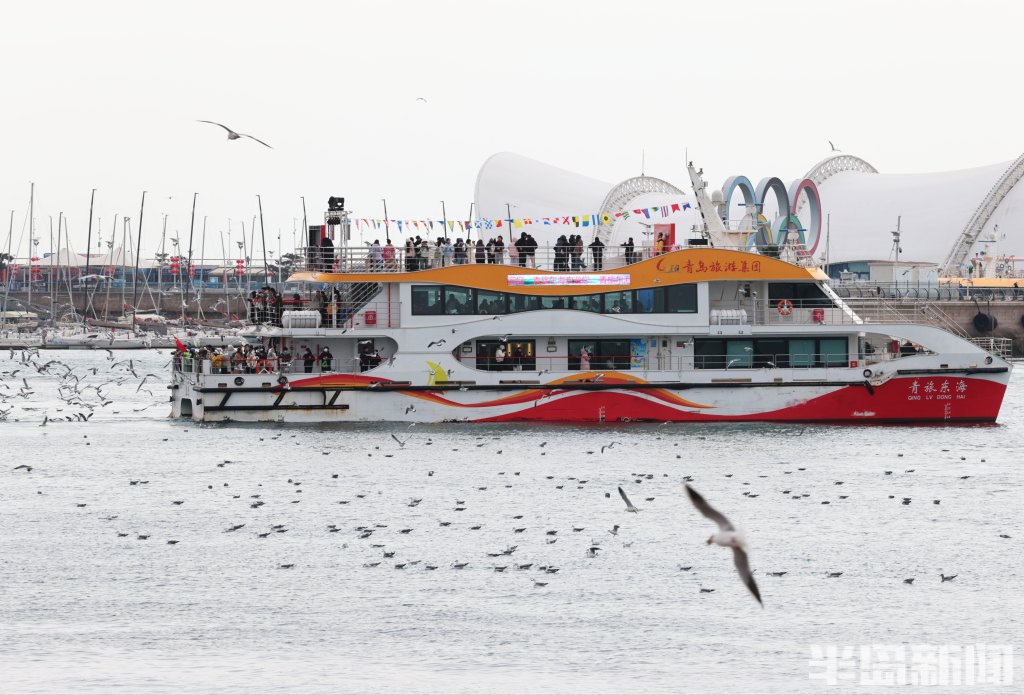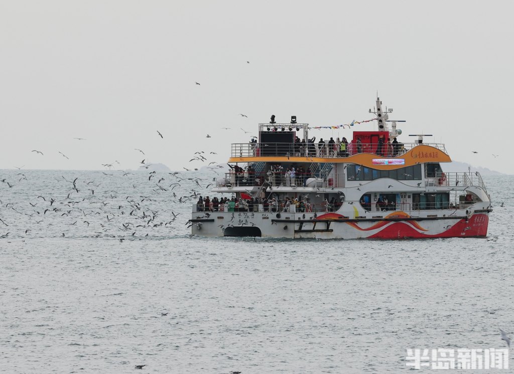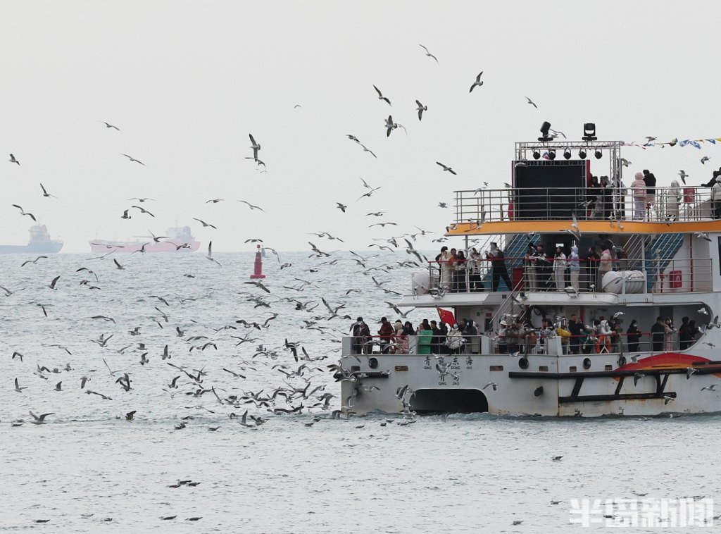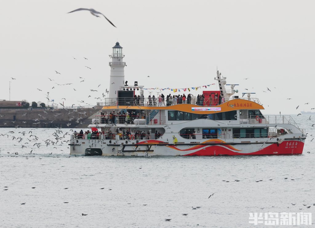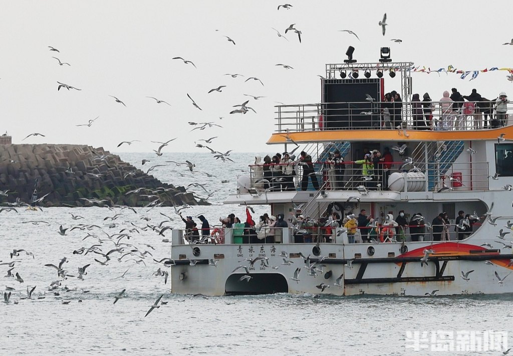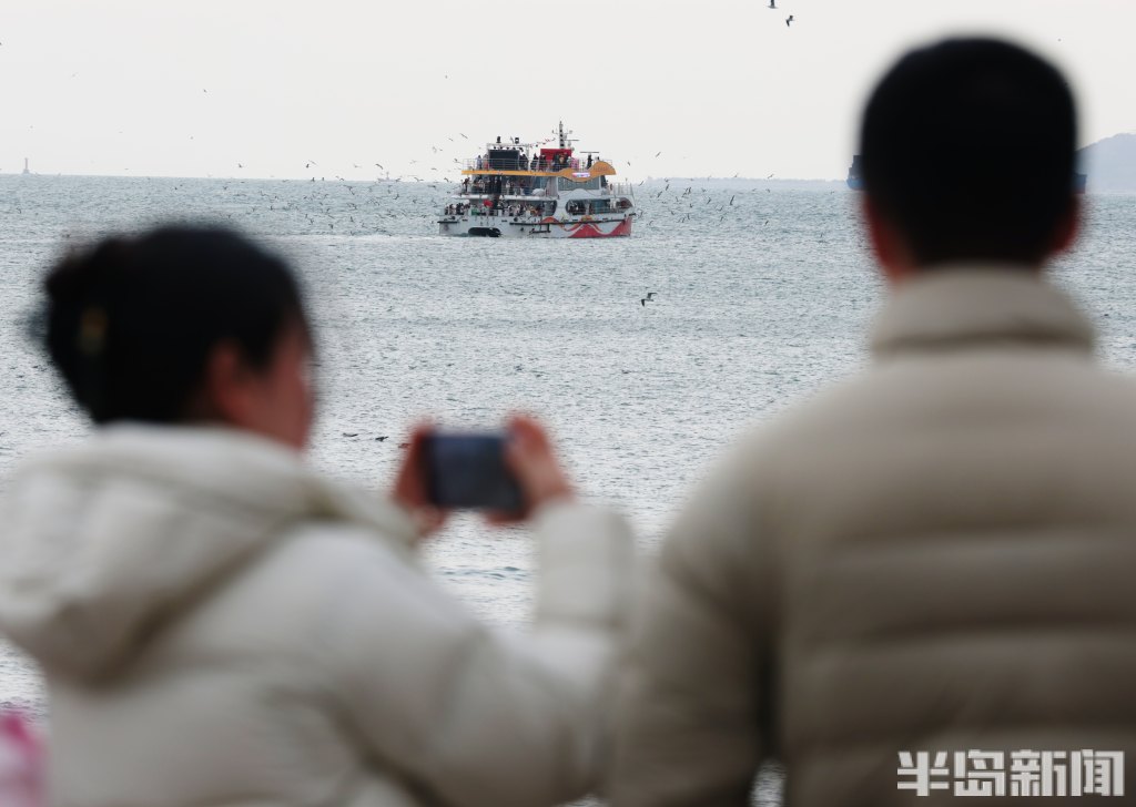 2月23日,是春节假期最后一天,青岛前海一线依然不少游客乘坐游船在海上观光游览。海面上,一艘艘观光游船的尾部,跟随着成群的海鸥,游客在船上投喂海鸥食物,海鸥叽叽喳喳围在船体的周围,游客拍照留影,一番祥和的氛围……(半岛全媒体记者王滨)