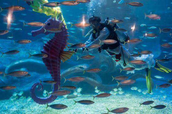 2月21日,正月初五,青岛极地海洋公园的表演池边围满了游客。随着水下鼓声响起,1.5米高的“海马”道具在潜水员的操控下,与“舞狮”在鱼群环绕间穿梭竞速。人群中,7岁的青岛男孩乐乐趴在玻璃上目不转睛,他的母亲张女士对记者感慨:“从来没想过能在水下看赛马和舞狮,孩子眼睛都不眨。这种传统和海洋的结合,太新奇了。”