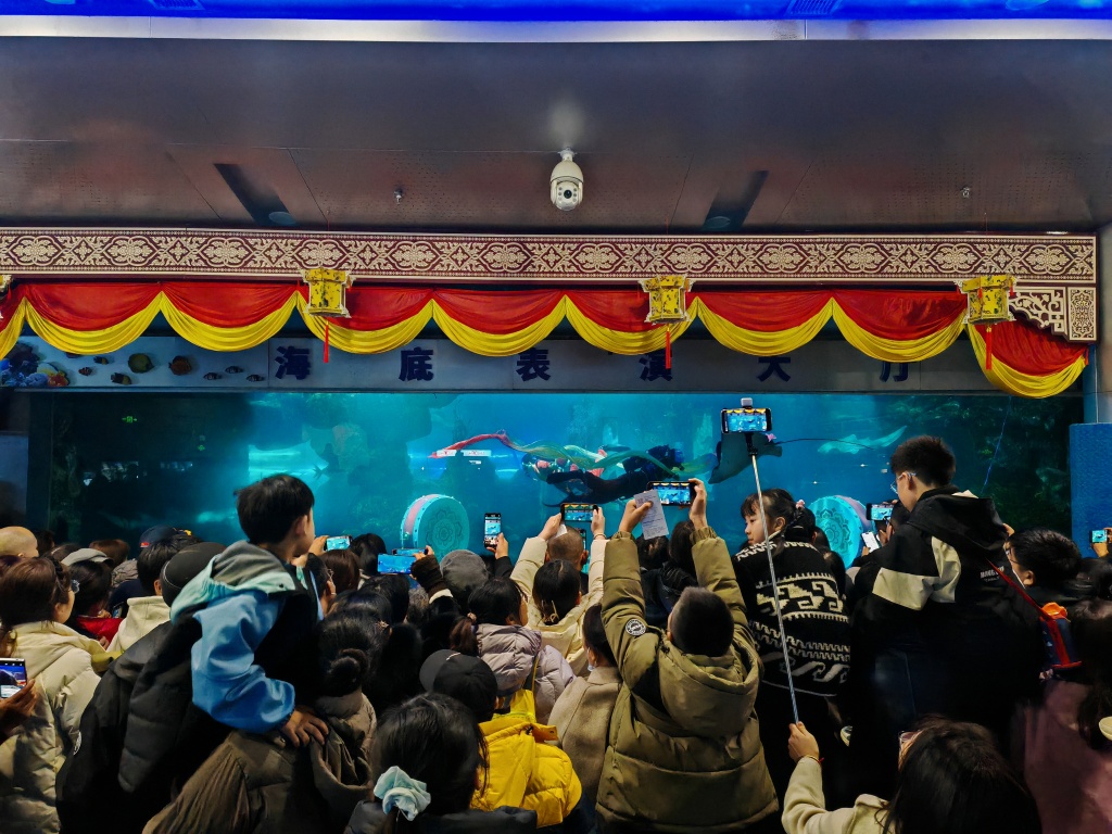 今年春节假期,青岛海底世界成为市民和游客出游的热门目的地。景区内人流如织,热闹非凡,一场融合传统与现代的国潮盛宴在这里精彩上演,青岛海底世界精心策划,每天推出20余场形式多样的表演,从水下到水上,从国风到喜剧,从早到晚轮番“炸场”,为游客奉上了一场全天候的“视听流水席”,而当“唐风仙子”优雅入水,与“龙马”装扮的潜水员共舞,气泡如万马奔腾腾空而起,将现场气氛推向高潮,据了解,截至正月初六,青岛海底世界接待游客约80000人次。