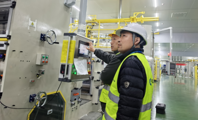 走进锂电池制浆区域,一台巨大设备正紧张安装。“这是行业首创的双螺杆连续制浆系统,传统需要12台设备,现在1台即可完成。”不远处,1.6米超宽涂布机和多层折叠式烘箱已初具雏形。