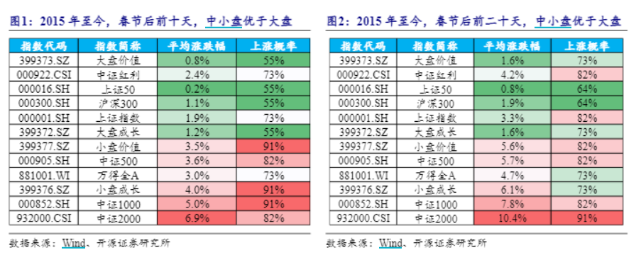 开源证券复盘春节后市场规律认为,节后5个、10个、20个交易日内,市场上涨概率逐步提升,大盘日渐回暖;风格上,呈现“中小盘优于大盘,成长占优”的特征,市场以追求超额为目的,中证2000涨幅和上涨概率均相对较高。华金证券复盘历史指出,节后A股大概率上涨,尤其是春节开启较晚的年份均上涨。一是2010年以来16年中春节后5个交易日内上证综指有12次上涨,节后20个交易日内上证综指有13次上涨。二是春节开启较晚的2010、2015和2018年春节后5个交易日内和20个交易日内上证综指均上涨。