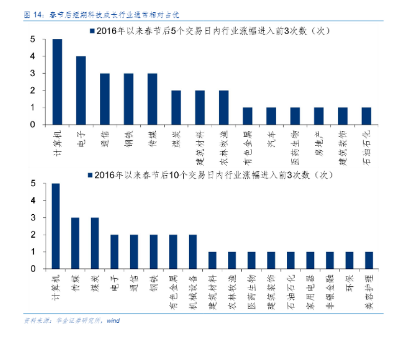 华金证券认为,节后科技成长和周期行业可能相对占优。复盘历史,一是春节后5或10个交易日内科技成长行业多相对占优。二是春节后短期行业占优主要受政策和产业催化、美股和港股映射等驱动。当前来看,今年春节后短期科技成长和周期行业可能相对占优。一是科技成长和周期行业相关的政策和产业催化短期可能持续不断。二是春节期间美股和港股涨幅靠前的行业主要集中在科技成长和周期行业中。