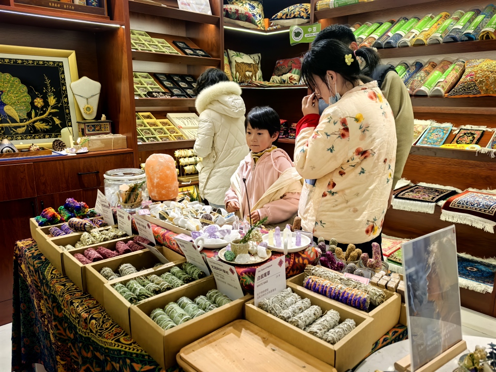 “春节期间,我们的游客量达到了平时的5倍,从上午开门那一刻到晚上关门,人流量一直不断。”上合国家旅游文化体验馆好物推荐官王钰钦介绍,从去年11月开始,他们陆续又增添了来自10余个国家的上百种物品,有围巾、首饰、挂件、珠宝等等。这些商品都是物美价廉,希望能为过年期间的游客带来更好的购物体验。