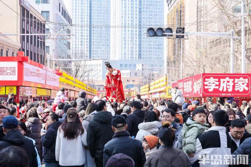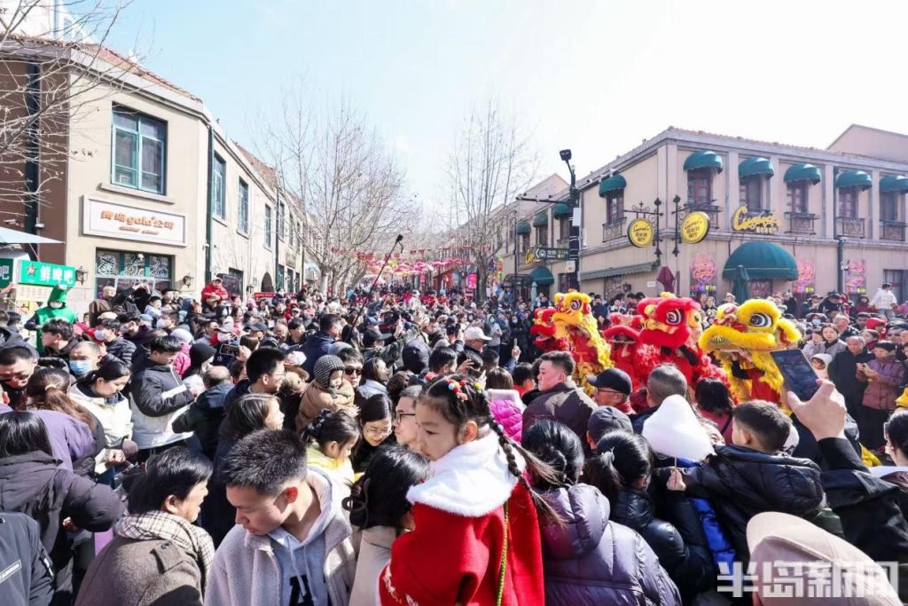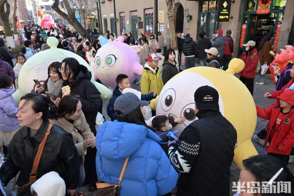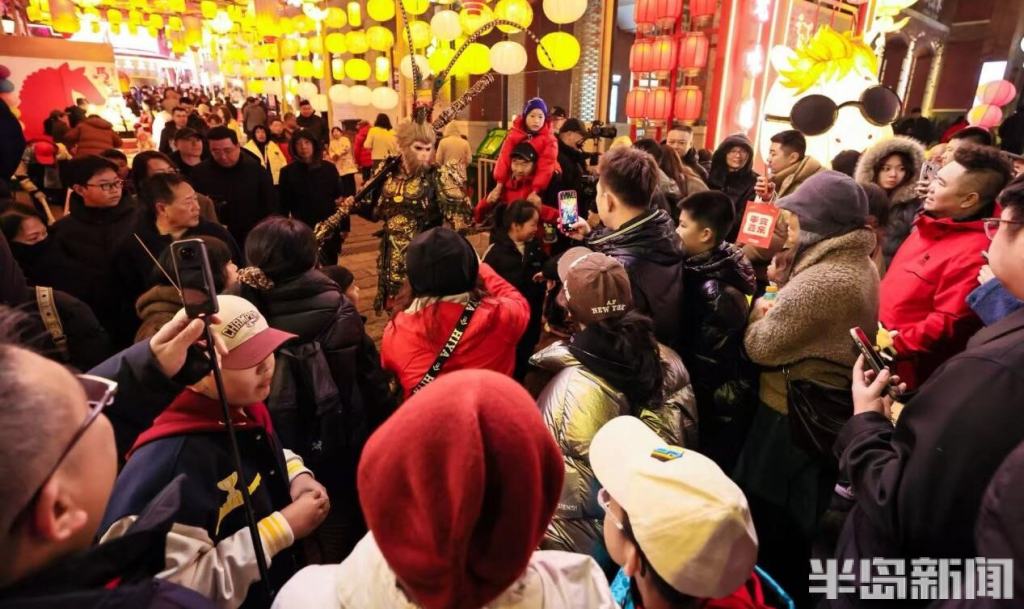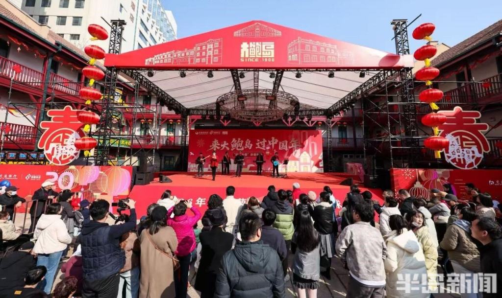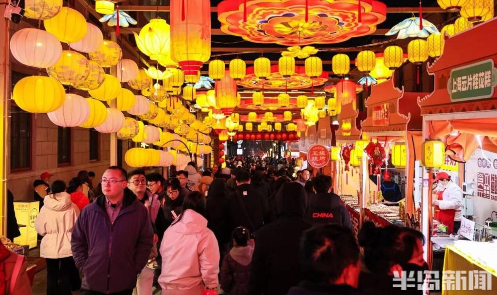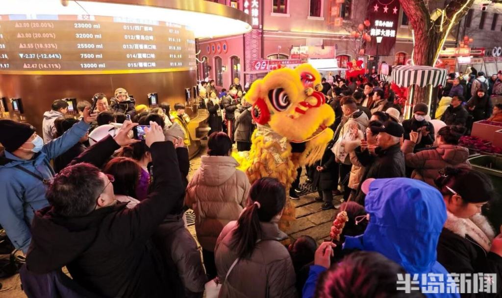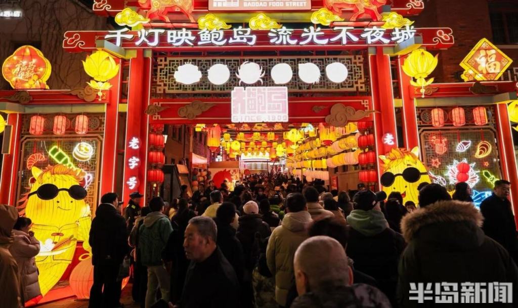 与此同时,“千灯映鲍岛·流光不夜城”新春灯会点亮大鲍岛北区,哪吒、鎏金天马等艺术灯组将非遗彩扎技艺与现代光影艺术相融,与里院的山墙拱券相映成趣;大鲍岛南区“马上鲍福—马宝鲍”IP主题展、永春里老青岛文化展同步开放,胶州路主轴200个市集摊位汇聚糖球萝卜、非遗手造,让市民在里院穿行中触摸城市记忆。
