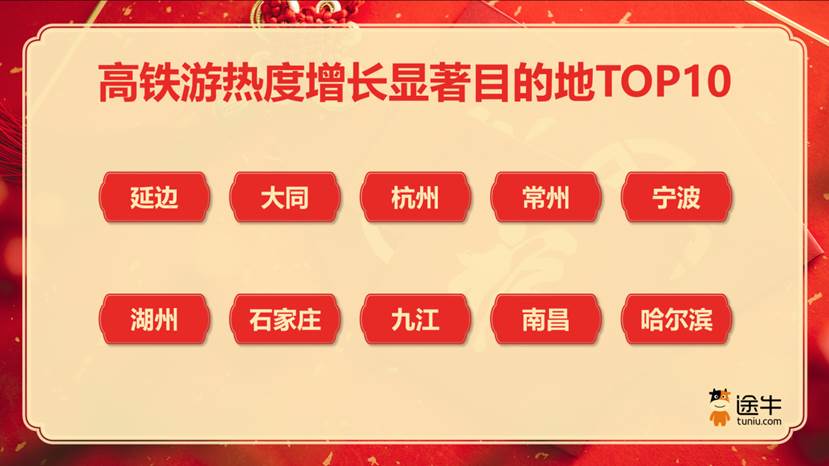 此外,延边、大同、杭州、常州、宁波、湖州、石家庄、九江、南昌、哈尔滨等目的地的高铁游热度增长显著。《报告》数据显示,延边、大同目的地高铁游出游人次较去年春节增长超80%,杭州、常州目的地高铁游出游人次较去年春节增长超50%。
