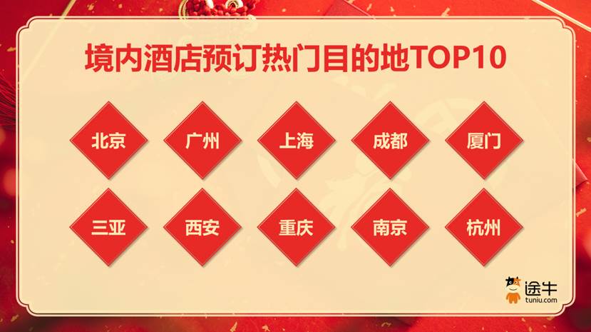 境内酒店预订方面,北京、广州、上海、成都、厦门、三亚、西安、重庆、南京、杭州等酒店预订热度排名靠前。相关目的地的亲子度假、主题酒店、特色民宿等成为途牛用户的热门选择。