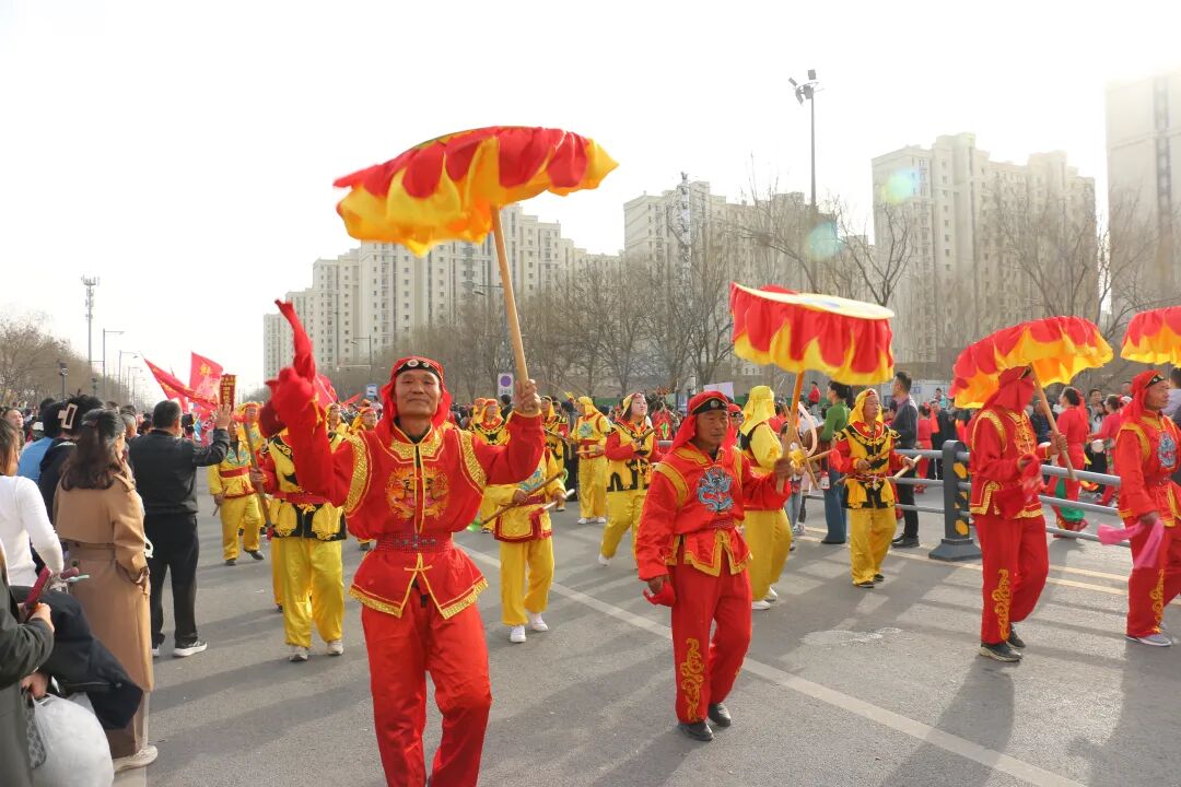 紧随其后的是鼓子秧歌、上杠高跷、董家伞棍鼓舞、曲堤金李小伞及舞龙舞狮、扮玩等本土非遗方队,来自回河街道、新市镇的本土表演团队演员身着鲜艳的服饰,挥动着彩扇和手帕,将扭、摆、走”演绎得淋漓尽致。表演者们精湛的技艺引得现场掌声雷动,大家纷纷举起手机,记录下这一个个精彩瞬间。