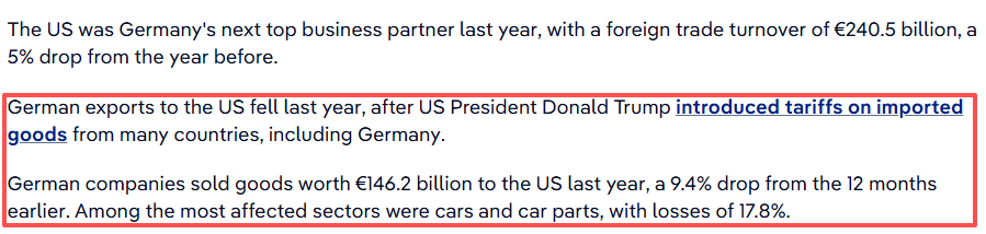 德国媒体的报道认为,由于美国总统特朗普对包括德国在内的诸多国家的进口商品加征关税,德美两国贸易额较2024年下降了5%,其中德国公司对美出口下降约9.4%,受影响较大的行业包括汽车以及汽车零部件行业。
