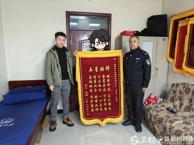 2月20日,昌吉市民陈先生也为昌吉市公安局刑侦大队民警送来了一面“别出心裁”的锦旗,上面写着“五星好评”。
