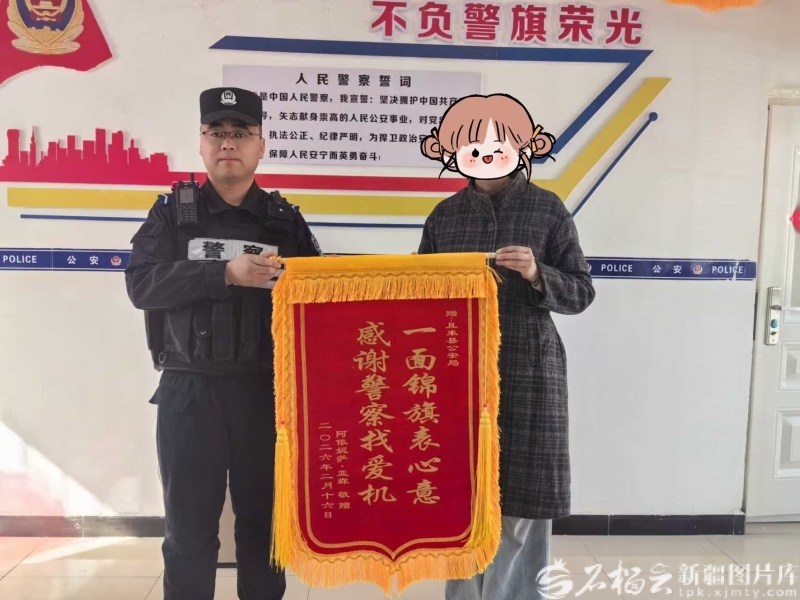 除夕当天,且末县公安局且末镇派出所巡逻防控队也收到一份特别的“新年礼物”——辖区居民阿女士将一面印有“一面锦旗表心意 感谢警察找爱机”的锦旗送到民警手中。