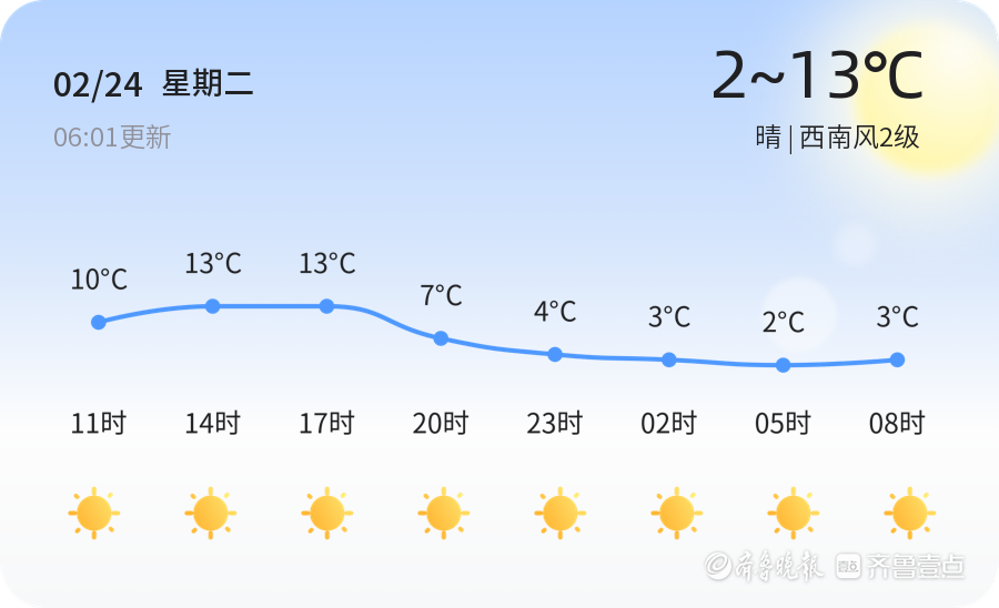 今天是2026年2月24日,星期二,农历正月初八。淄博市今天以晴好天气为主,气温较为温和,早晨最低气温为2℃,白天最高气温可达13℃,西南风2级,空气湿度为69%。当前PM2.5指数为56,空气质量为良,适合户外活动。不过,早间气温较低,市民出行时仍需注意保暖,建议佩戴口罩以防止呼吸道不适。午后阳光明媚,适宜进行户外锻炼和日常活动。未来三天,淄博市天气将呈现显著变化。明天周三,我市将迎来升温高峰,白天最高气温将升至17℃,最低气温为6℃,天气由多云转阴,南风风力较小。周四则以阴转多云天气为主,气温有所回落,最高气温11℃,最低气温1℃,东北风风力较大,阵风可达4级。周五天气转晴,气温继续下降,最高气温12℃,最低气温-1℃。温馨提示