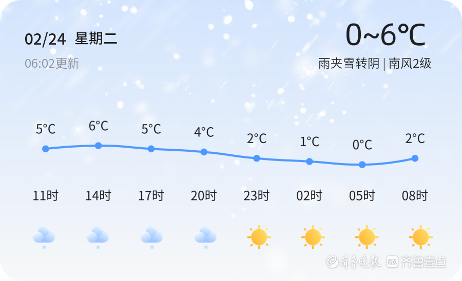 今天是2月24日,正月初八,烟台迎来雨夹雪转阴的天气。当前气温为2.7℃,南风2级,空气湿度76%,PM2.5指数为31,空气质量为优。雨雪天气可能导致道路湿滑,建议市民出行时注意防滑,驾车时减速慢行,保持车距。携带雨具以备不时之需。气温较低,市民需做好保暖措施,避免感冒。
