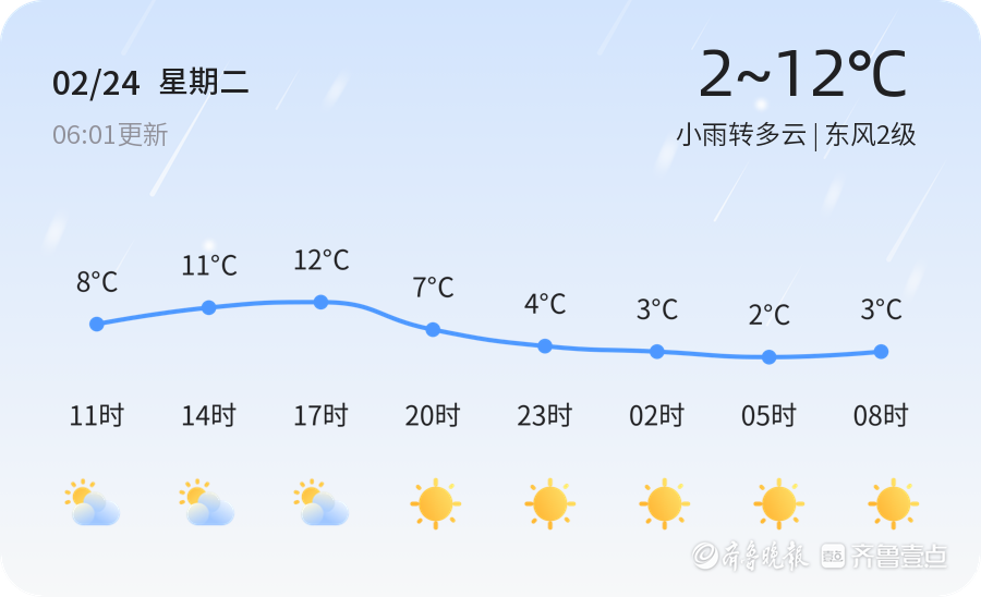 今天是2026年2月24日,农历正月初八,星期二。枣庄市薛城区今天天气为小雨转多云,温度范围在2℃到12℃之间,东风2级,湿度87%。空气质量良好,PM2.5浓度为27,属于优级水平。今天的天气对市民出行有一定影响,特别是早上的小雨可能会导致路面湿滑,建议市民出行时携带雨具,注意交通安全。同时,由于温度较低,市民需做好保暖措施,避免感冒。