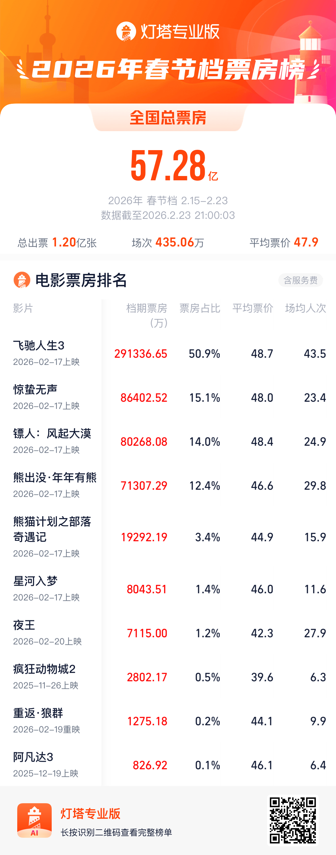 2月23日,2026春节档正式收官。截至当日21时,从2月15日开始持续9天的春节档共收获票房57.28 亿。其中《飞驰人生3》以29.13亿拿下冠军,占比过半,也是档期内唯一一部过20亿影片。《惊蛰无声》以 8.64亿获得亚军。《镖人:风起大漠》以8.02亿获得季军。今年春节档头部影片口碑都还不错,有望节后长线热映。(潮新闻)