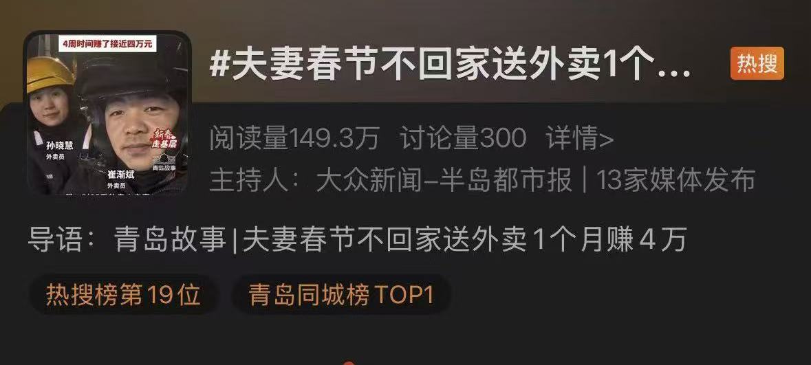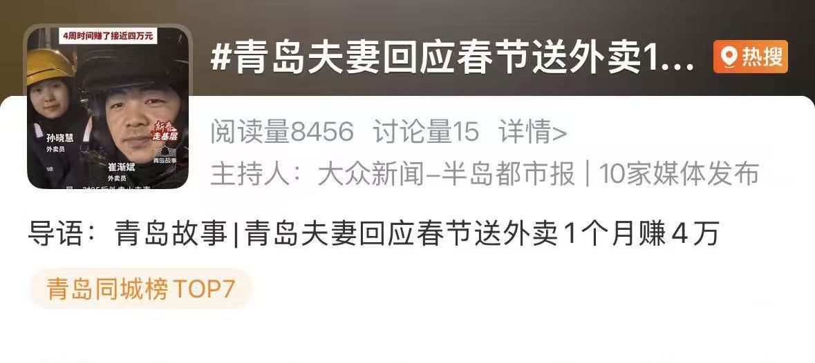 #青岛夫妻回应春节送外卖1个月赚4万#