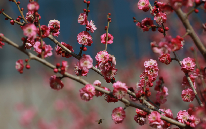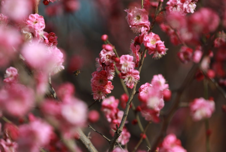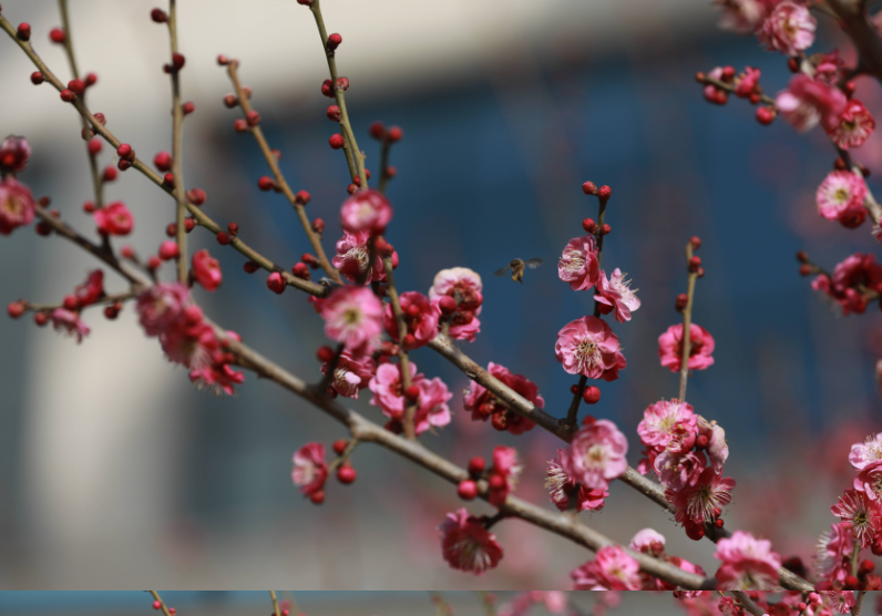 走进市民中心,广场上的梅树早已褪去冬日的沉寂,枝头繁花似锦。有的花朵如胭脂般浓艳,层层叠叠的花瓣簇拥着嫩黄的花蕊;有的则似初雪般淡雅,轻盈舒展,在微风中轻轻摇曳。蜜蜂在花丛中穿梭飞舞,采集着春日的芬芳,为这幅静态的美景增添了灵动的生机。