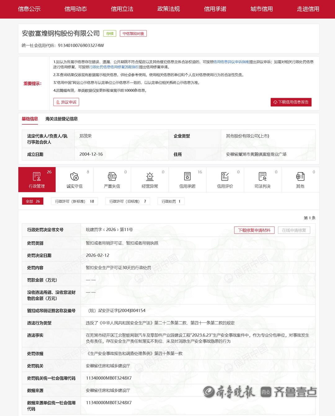 近日,齐鲁晚报·齐鲁壹点记者从信用中国获悉,安徽富煌钢构股份有限公司(富煌钢构 002743)在芜湖市经开区江北智能网联汽车及零部件产业园建设工程“2023.6.23”生产安全事故案件中,作为专业分包单位,对事故发生负有责任,存在安全生产责任制落实不到位、未及时消除生产安全事故隐患的行为,被安徽省住房和城乡建设厅暂扣安全生产许可证30天的行政处罚。