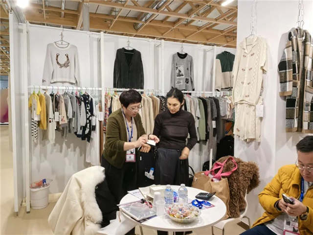 18平方米的两个展位,挂满了各种样式的针织类毛衫、梭织类外套,威海隆一贸易有限公司总经理李兴龙向来往客户热情介绍着自家针织、梭织、毛衣等三大类产品。