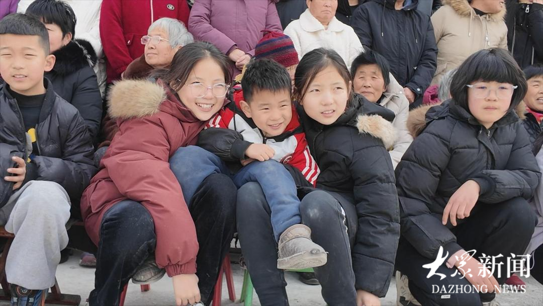 村里的年轻人苏培昊也是专门从济南赶回来的,常年在外奔波,难得回趟家,正跟乡亲们说说笑笑。孩子们看见无人机飞起来,兴奋地举手指;乡亲们互相帮忙整整衣襟,把红围巾戴正;还有人举起“福”字往镜头前凑。