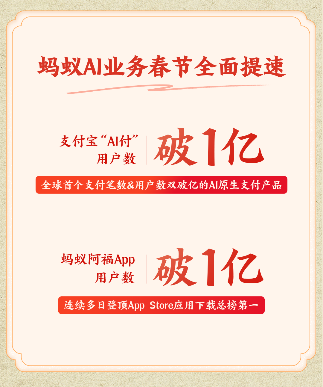 马年大年初七,蚂蚁集团披露春节假期实战数据,核心AI业务实现全面爆发:支付宝“AI付”用户数突破1亿,蚂蚁阿福APP的总用户数也突破1亿大关。在AI技术进入大规模应用的第一个春节,蚂蚁凭借在支付与健康领域的表现,在春节AI大战中实现了差异化突围。
