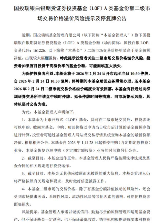 2月23日,国投白银LOF(161226)公告,基金将于2026年2月24日开市起至当日10:30停牌,自2026年2月24日10:30复牌,停牌期间本基金赎回业务照常办理。