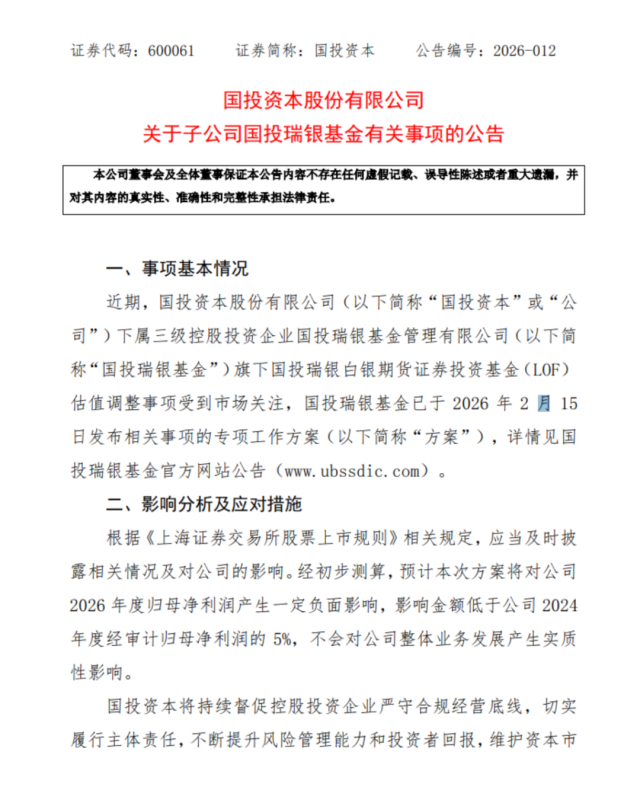 2月23日晚间,国投资本公告称,近期,公司下属三级控股投资企业国投瑞银基金管理有限公司(简称“国投瑞银基金”)旗下国投瑞银白银期货证券投资基金(LOF)估值调整事项受到市场关注,国投瑞银基金已于2026年2月15日发布相关事项的专项工作方案。