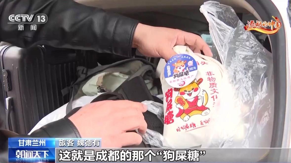 旅客 魏德有:我是从新疆石河子市一路自驾到成都,然后现在准备回,最主要就是去成都的熊猫基地看大熊猫。还有买的礼物,这些就是成都的“狗屎糖”,还有伴手礼、冰箱贴这种。