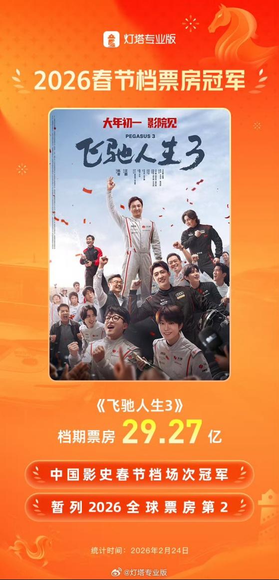 2026年春节档落下帷幕,中国电影市场迎来“开门红”。据灯塔专业版数据,截至2月24日9时,2026年春节档总票房57.52亿元,总人次1.20亿,其中《飞驰人生3》以29.27亿元的票房断层领跑,不仅登顶春节档票房冠军,更凭借其强劲走势暂列2026年全球票房榜第二位。