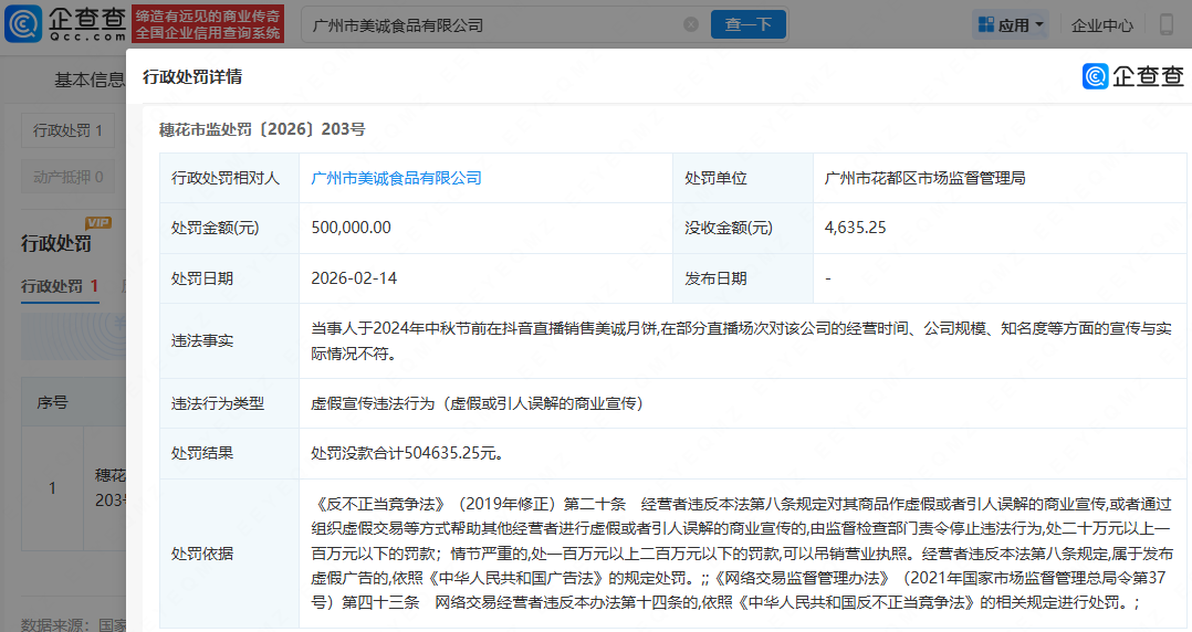 企查查APP显示,近日,因存在虚假宣传违法行为(虚假或引人误解的商业宣传),广州市美诚食品有限公司新增一项行政处罚,违法事实为当事人于2024年中秋节前直播销售美诚月饼,在部分直播场次对该公司的经营时间、公司规模、知名度等方面的宣传与实际情况不符。广州市花都区市场监督管理局对该公司罚款50万元,没收金额4635.25元,合计罚没约50.46万元。