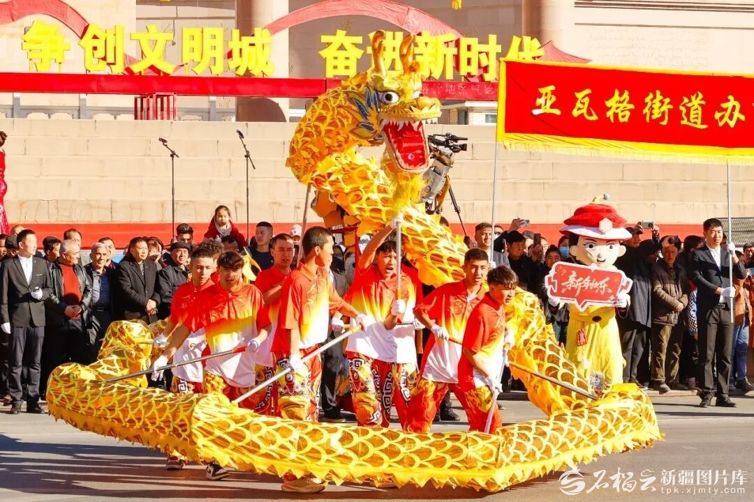 2月22日,喀什市“骏马踏春闹古城·同心筑梦启新程”社火巡游启幕。图为在喀什市人民广场举行的舞龙表演。 侯立超摄