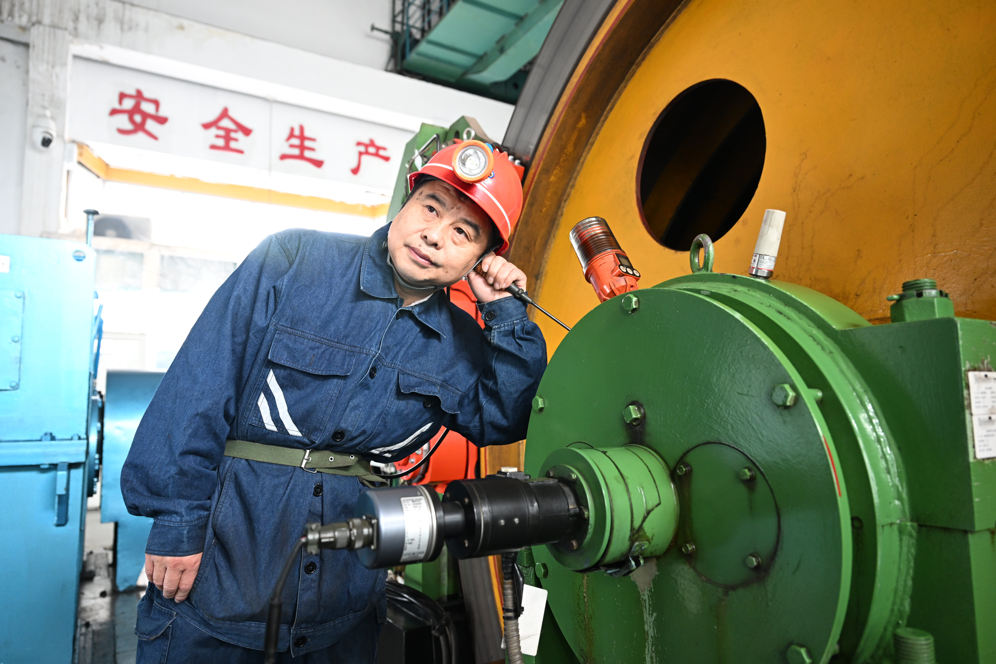 俯身、侧耳、凝神,郭金陵手中的螺丝刀轻轻贴在提升机滚筒端部轴承上,仔细探听内部运转声响,神情专注而凝重。“细观察、听声音、嗅气味、感温度”,这套自创的故障判定法,在数十年巡检中早已融入骨髓,成为精准排查隐患、守护设备安全的“独门绝技”。他沿着矿井提升系统逐项巡视,紧盯液压站盘形闸制动系统数据,精准调节减速箱润滑泵站油压流量;遇到在岗司机,便细致询问设备运行细节,不放过任何细微异常;驻足电控柜前,核对参数、感知温度、辨别气味,将各类安全风险扼杀在萌芽状态。